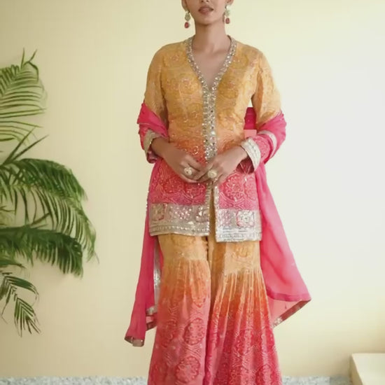 This stunning Blue and Green Bandhani dress is a perfect blend of traditional charm and modern elegance. Crafted from high-quality Real Chinon fabric, the top, dupatta, and plazoo feature intricate digital prints that add a contemporary touch to the classic Bandhani design. The dress is beautifully adorned with delicate embroidery and mirror work, creating a mesmerizing, reflective effect that enhances its overall appeal.